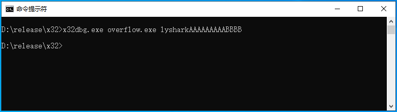 我们开始分析程序,由于overflow.exe程序需要命令行传参分析,所以读者应该将overflow.exe程序复制到x64dbg调试器目录下,并在CMD中执行;
