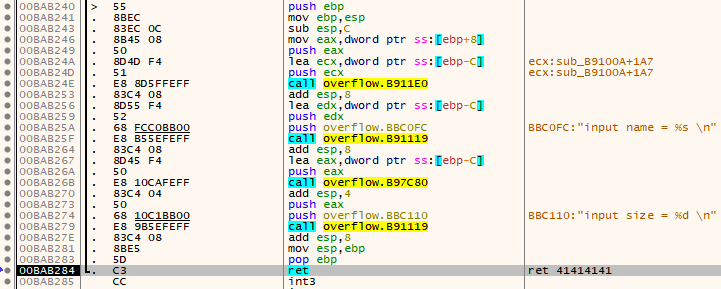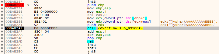 我们需要在命令行界面中来启动调试器,其中第一个参数overflow.exe就是程序名,第二个参数是传入的命令行参数,我们知道缓冲区长度是10个字符,为了能够让程序产生溢出,此处输入的数据必须要大于10个字节,这里我就输入一串lysharkAAAAAAAAABBBB字符串,如下图所示,当程序被运行时EDX寄存器指向的则是我们自定义输入的字符串,由于要调用CALL指令,此处的CALL指令代表的是geting函数,所以需要将EDX字符串压栈存储,而在进入geting函数之前,CALL指令需要将自身下一条指令压栈存储,但此时由于我们输入的数据大与栈地址所能容纳的最大值,因此在压栈时势必会造成覆盖栈空间的情况产生;