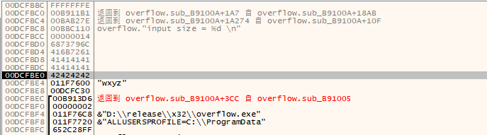 我们来看一下当前堆栈中的数据,可以看到在程序调用Ret时,EIP一定会被填充为一串毫无意义的42424242的内存地址,而当这段连续的A被替换成ShellCode的反弹地址时则此时将会发生可怕的事情。
