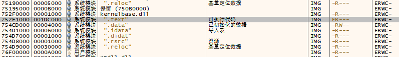 为了实现搜索特征码读者需要切换到kernelbase.dll模块,通过在内存布局中点击.text节即可完成切换,当然如果其他模块中存在此类特征也是可以使用的,选择此模块是因为此模块中存在。