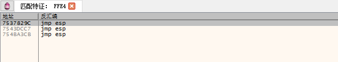 接着按下Ctrl+B输入FFE4特征码,实现搜索功能,如下图所示,其中的三个地址都是可以被利用的跳板;