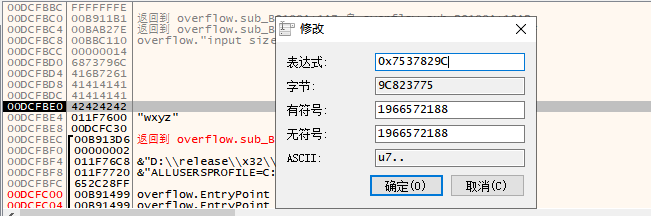 此时我们以0x7537829C为例,为了模拟这个流程修改堆栈中的0x42424242为0x7537829C则当程序返回时会自动跳转到0x7537829C地址处;
