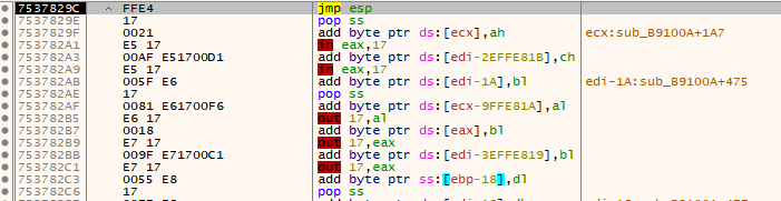 当程序被执行此跳板时,则会跳转到当前堆栈的内存区域,而如果此处是攻击者构造好的一块恶意ShellCode代码,则将会实现反弹后门的目的,并以此获取主机的完全控制权;