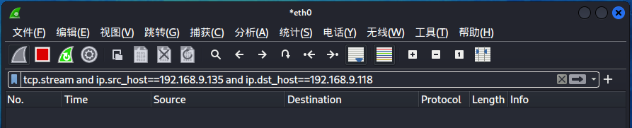 - 过滤语句:tcp.stream and ip.src_host==192.168.9.135 and ip.dst_host==192.168.9.118