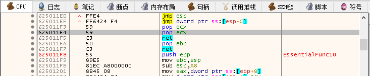 需要注意的是:在构建ROP链的时候,如果RET返回之前是一个影响堆栈的指令,那么我们就需要在ROP堆栈链的下方手动填充一些垫片来中和掉POP等指令对堆栈的影响,因为下一条指令也会从堆栈中取值,如果不中和掉这些无用代码的影响则ROP链将无法被正常执行,比如如下图这条代码POP ECX影响了堆栈,如果不是我们所需要调用的参数,那么我们就在他的下面填充一些填充物来中和一下。