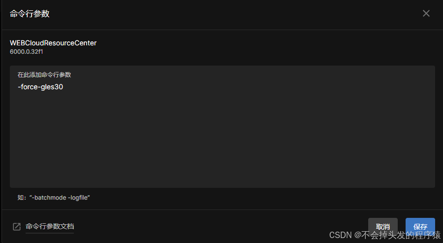 在Unity Hub 启动项目时添加下令行参数修改为OpenGL ES 3.0渲染