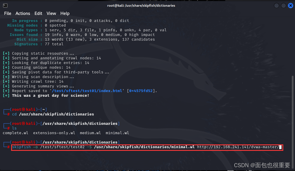 skipfish -o /test/sftest/test02 -S /usr/share/skipfish/dictionaries/minimal.wl http://192.168.241.141/dvwa-master/