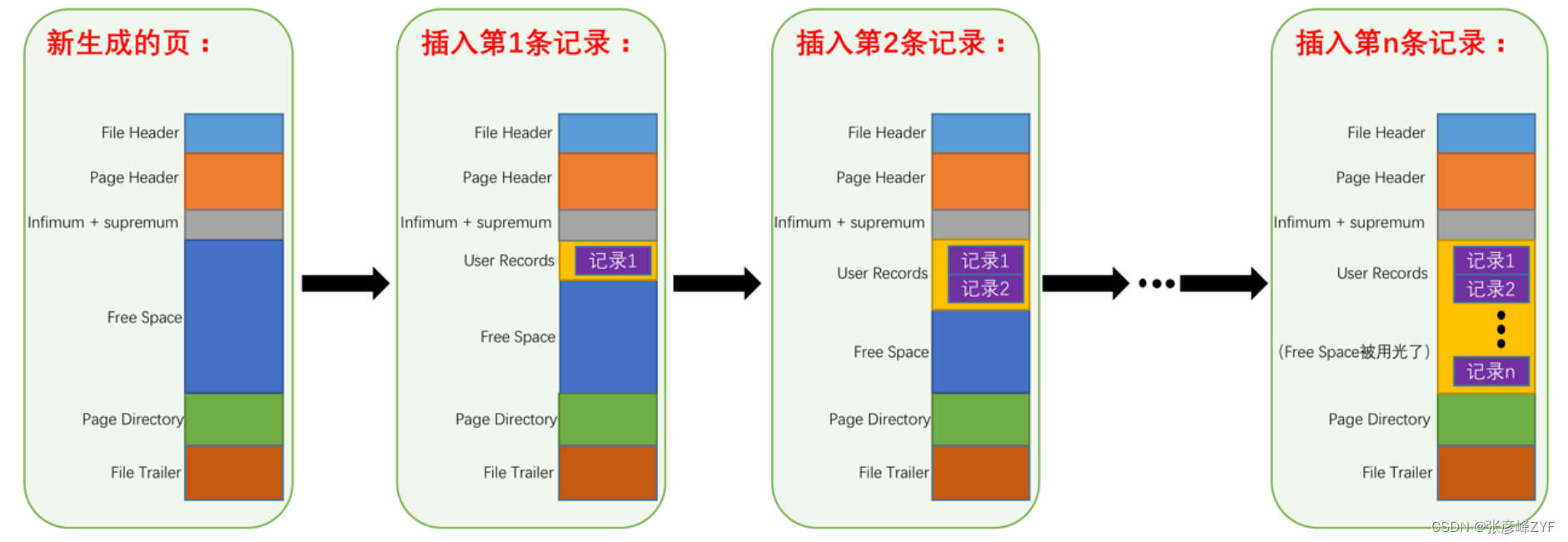 - 页满状态:当 Free Space 部门被完全斲丧,整个数据页被 User Records 部门占据,意味着该页已满,无法再存储新的纪录。