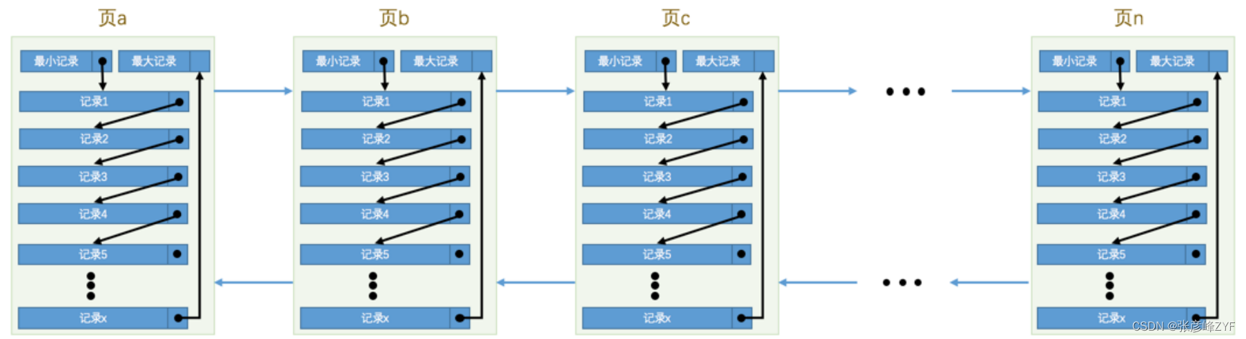 在 InnoDB 中,数据页通过双向链表毗连,每个数据页内的纪录行按照主键值从小到大的次序构成单向链表,而且每个数据页都有一个页目任命于快速定位纪录。