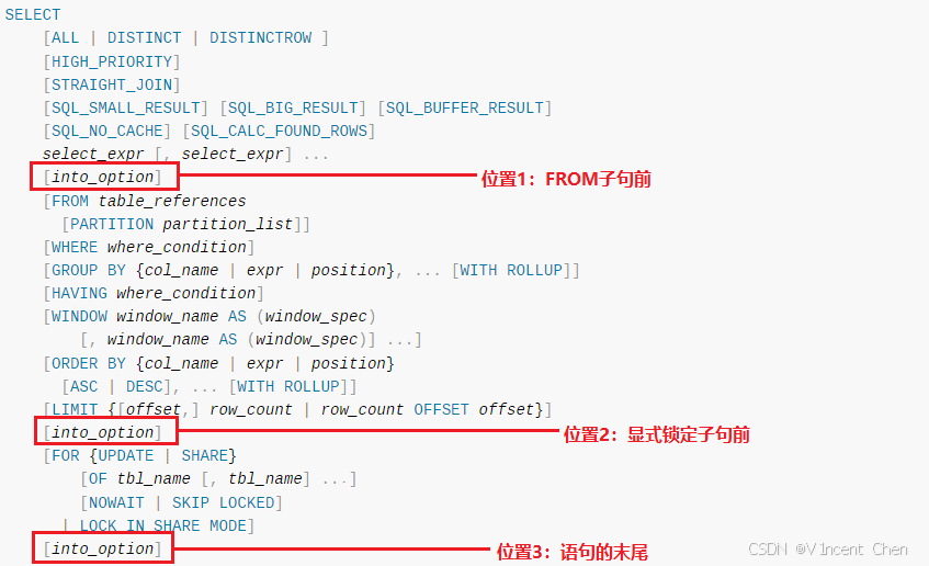 根据官方文档,into子句可以出现在以下3个位置。固然3个位置都符合语法,但select语句中至多只能有1个into语句(位置三选一):