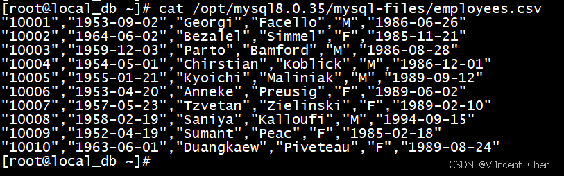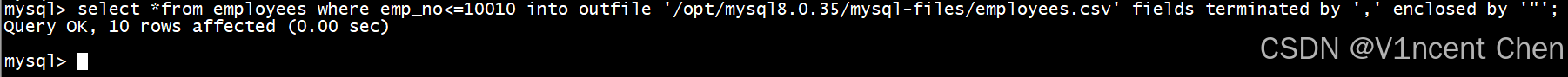 - select *from employees where emp_no<=10010 into outfile '/opt/mysql8.0.35/mysql-files/employees.csv' fields terminated by ',' encolsed by '"';