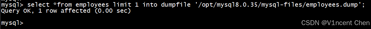 - select *from employees limit 1 into dumpfile '/opt/mysql8.0.35/mysql-files/employees.dump';