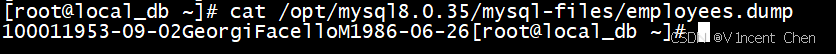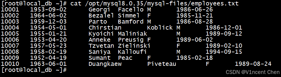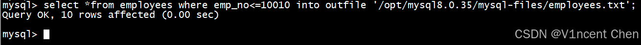 - select *from employees where emp_no<=10010 into outfile '/opt/mysql8.0.35/mysql-files/employees.txt';