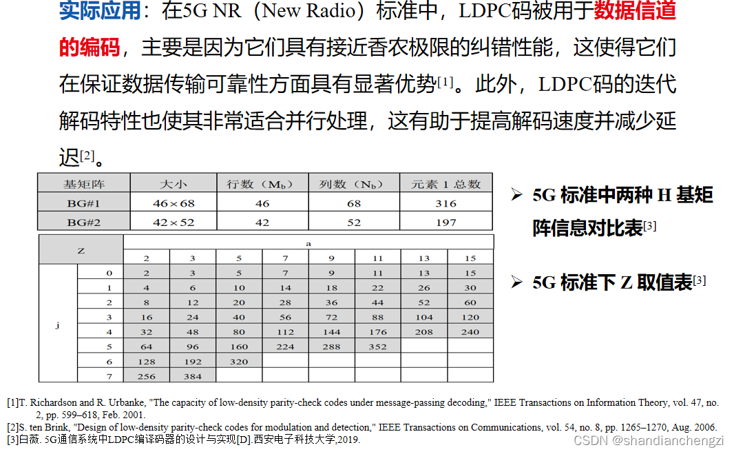 在5G NR(New Radio)标准中,LDPC码被用于数据信道的编码,重要是由于它们具有靠近香农极限的纠错性能,这使得它们在包管数据传输可靠性方面具有明显上风[10]。别的,LDPC码的迭代解码特性也使其非常恰当并行处置惩罚,这有助于进步解码速率并镌汰耽误[11]。