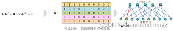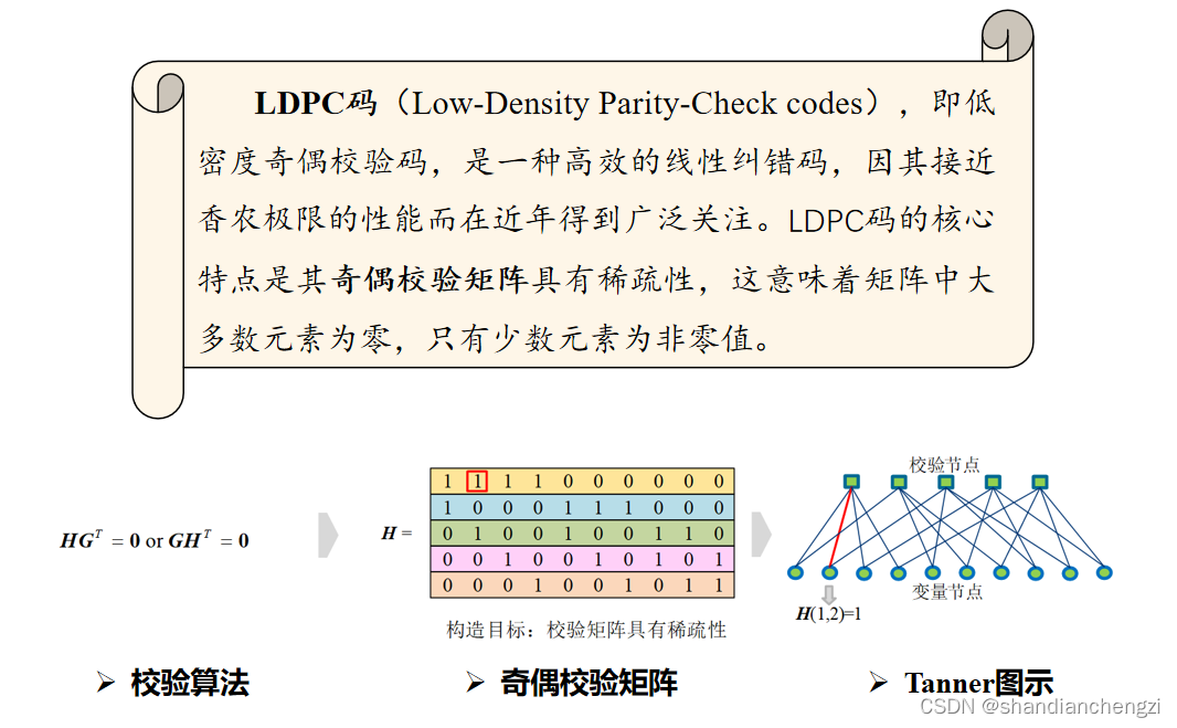 LDPC码(Low-Density Parity-Check codes),即低密度奇偶校验码,是一种高效的线性纠错码,最初由Robert G. Gallager[1]在1960年代提出,因其靠近香农极限的性能而在比年得到广泛关注。LDPC码的核心特点是其奇偶校验矩阵具有奇怪性,这意味着矩阵中大多数元素为零,只有少数元素为非零值,LDPC码的校验矩阵、Tanner图如图1所示。这种奇怪性使得LDPC码的编码息争码过程更加高效。由于这种布局不但简化了编码过程,而且使得解码过程可以通过高效的迭代算法来实验。LDPC码的编码涉及将信息比特通过奇偶校验矩阵转换为校验比特,而解码则通常接纳置信传播算法或其变种,这些算法利用图论和概率论原理,通过迭代过程不停改进解码效果。