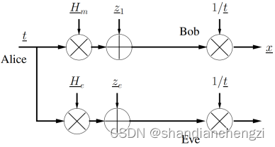 图3 高斯有线窃听信道模子表示图 在物理层安全的研究中,除了思量窃听者的被动监听举动,还必要思量自动攻击的情况。2011年,Wong等人[7]针对BPSK(Binary Phase-Shift Keying)受限的高斯有线窃听信道,提出了一种基于LDPC码的机密共享方案。他们展示了怎样利用LDPC码的随机聚集来实现渐近于BPSK受限高斯有线窃听信道密钥容量的机密共享。