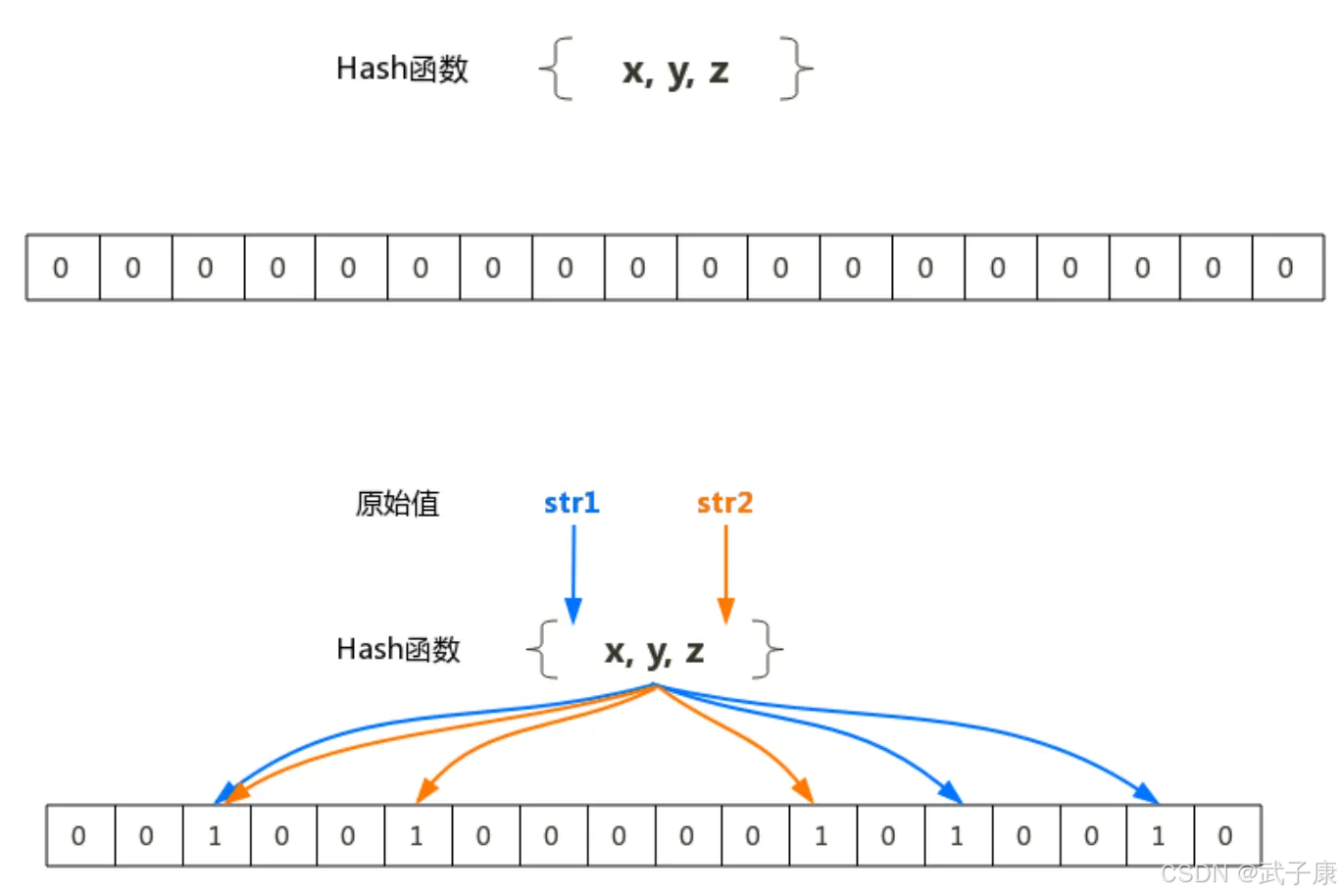 - 创建一个长度为m的位数组,全部位初始化为0