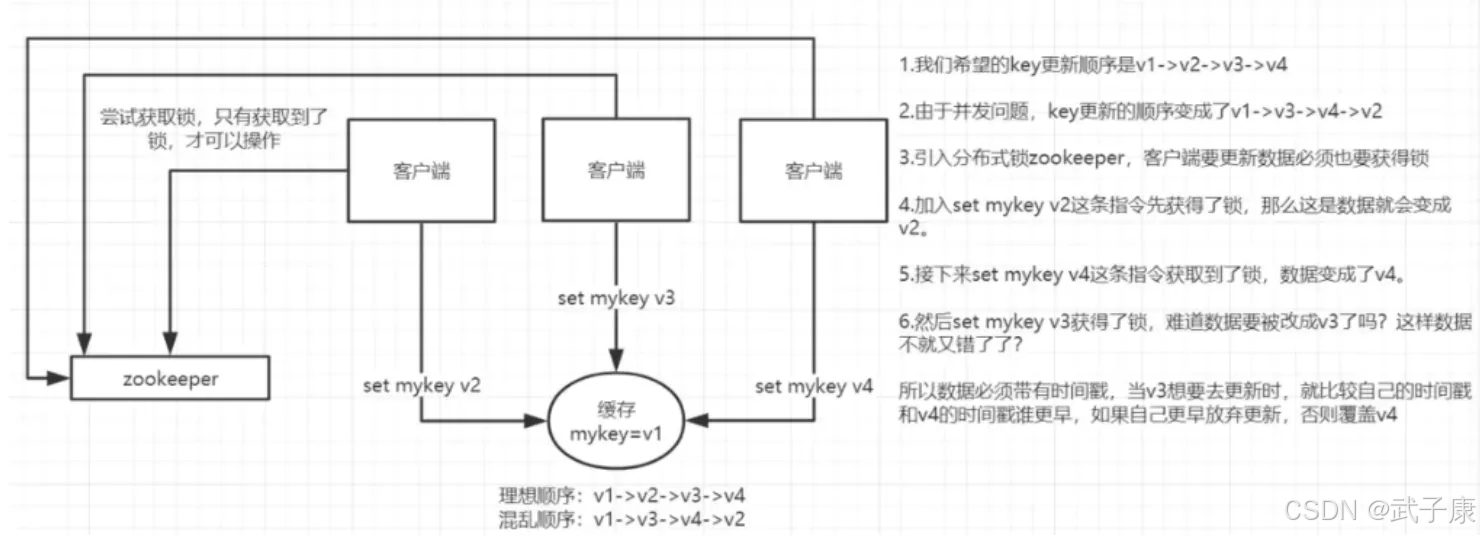 多个客户端并发写一个 key,比如写哀求:1、2、3、4,末了原来是4,但是由于到达时间序次题目,成了 2、1、4、3。