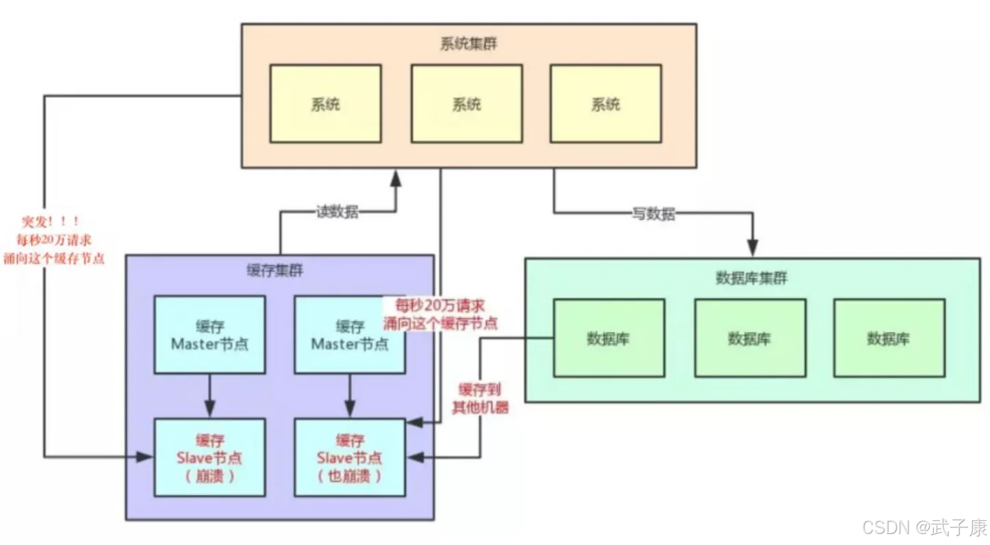 当有大量的哀求(几十万)访问Redis中某个Key时,导致Redis的服务宕机了。接下来就导致流量会进入到DB中。