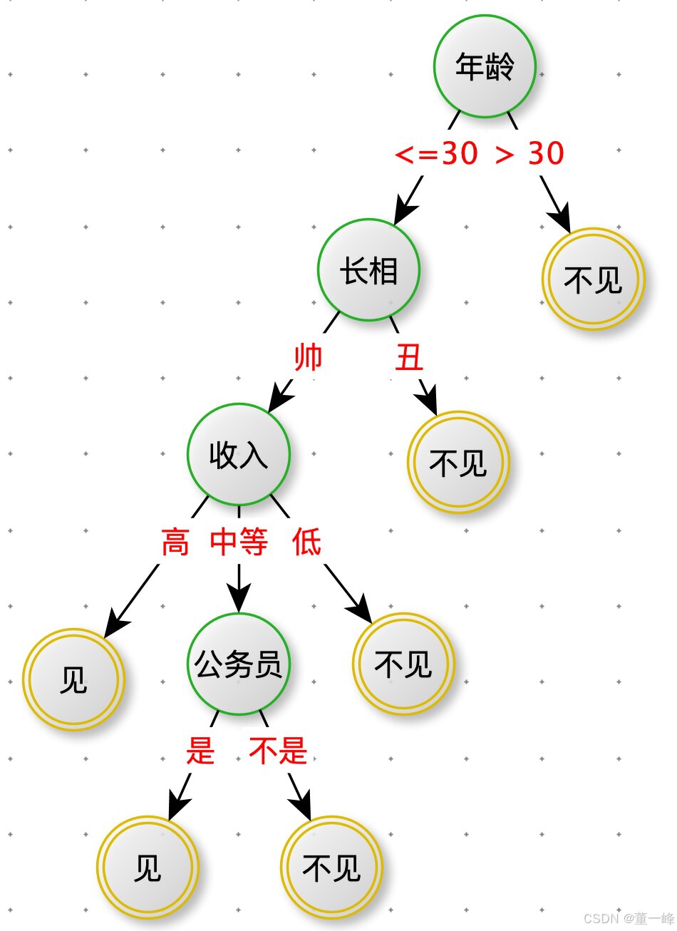 这个女孩的决议过程就是典型的分类树决议。相当于通过年龄、长相、收入和是否公务员对将男人分为两个类别:见和不见(二分类)。