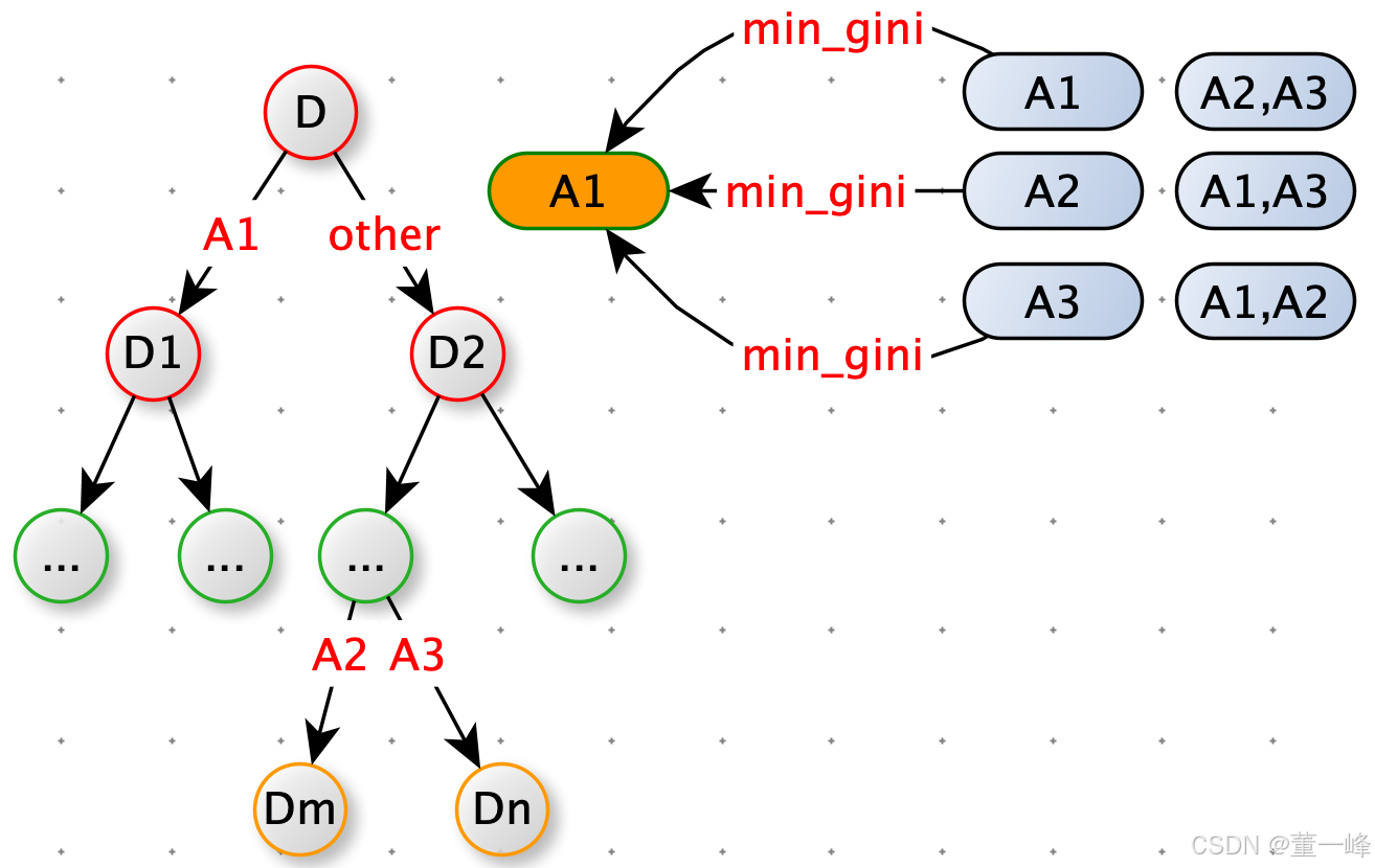 CART 分类树会将 A 拆成 {A1} 和 {A2 , A3} , { A2 } 和 {A1 , A2} ,{ A3 } 和 { A1 , A2 } 分组,找基尼系数最小的组合,比如 { A1 } 和 {A2 , A3},一个节点是 A1对应样本,另一个节点是不即是 A1 的样本(类似 One-Hot-Encoding),后续另有机会处理 {A2} , {A3}