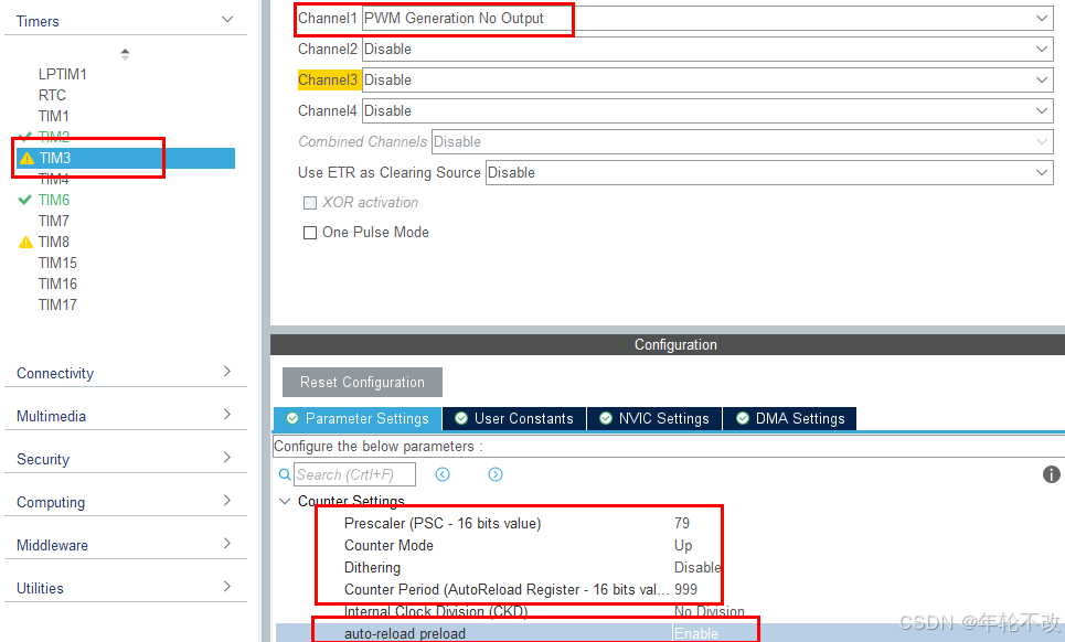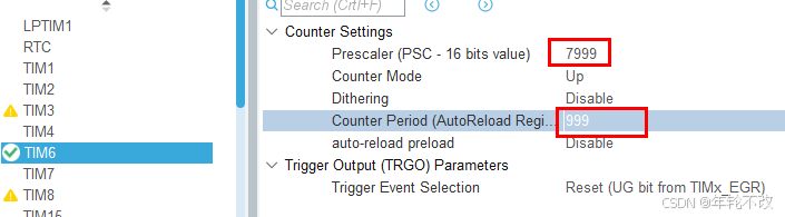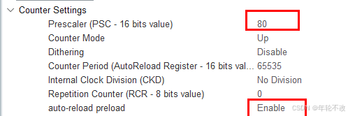 选择80分频,一兆的频率进行1000计数,频率就是1000HZ,使能自动重装载。