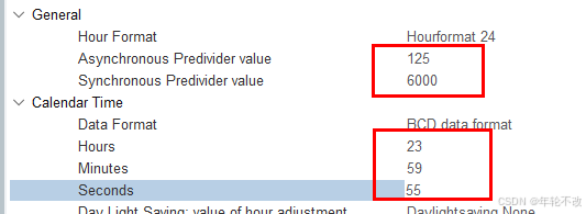 RTC时钟频率 = RTC时钟源 / ((Asynchronous Predivider value + 1) * (Synchronous Predivider value + 1))