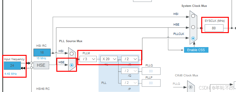 输入频率其实就是晶振提供的24MHz,采用HSE(高速外部时钟源)。至于SYSCLK 系统时钟的80MHz 可以通过 PLLM、PLL配置出来。
