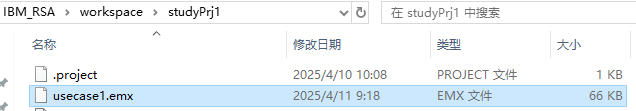 从上图可以看出,按模板创建用例模型后,RSA主动为我们创建了该模型的文件夹结构,便于我们对模型元素举行相应的调整和更新。通过我的实际感受,这些文件夹结构是假造的,也就是说,在电脑文件夹中并不存在上面的文件夹结构,我们在项目文件夹中看到的还是一个.emx文件。如下图: