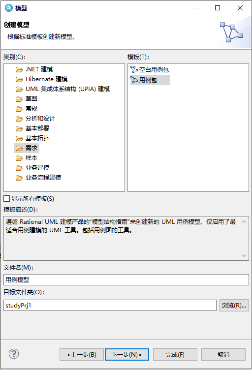 在上图中点击“下一步”,在出现的图中,在“种别”处选择“需求”,在“模板”处选择“用例包”,如下图: