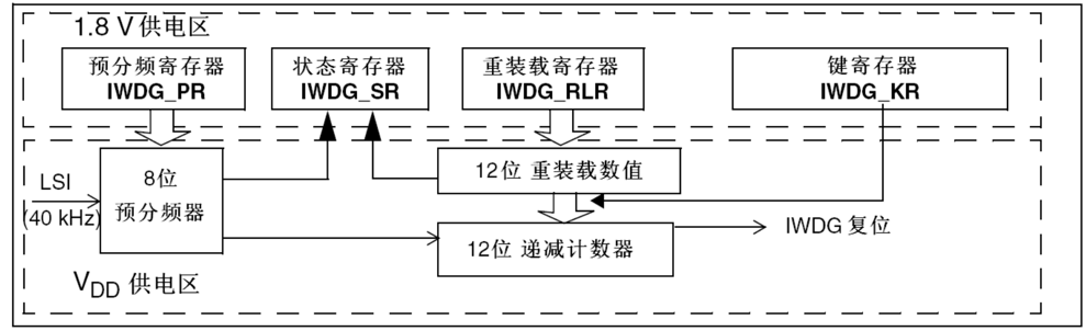 - 看门狗功能处于VDD供电区,即在停机和待机模式时仍能正常工作