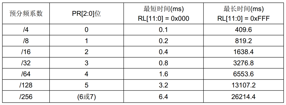 - 超时时间:TIWDG = TLSI x PR预分频系数 x (RL + 1)