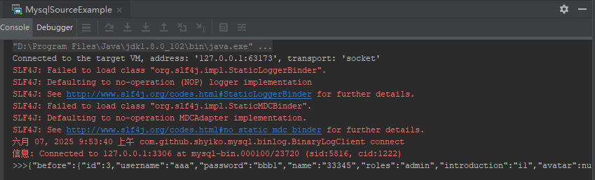 启动后web页面地址访问http://localhost:8081/,MySQL数据库canal_manager中的表canal_user数据发生修改,控制台有输出json: