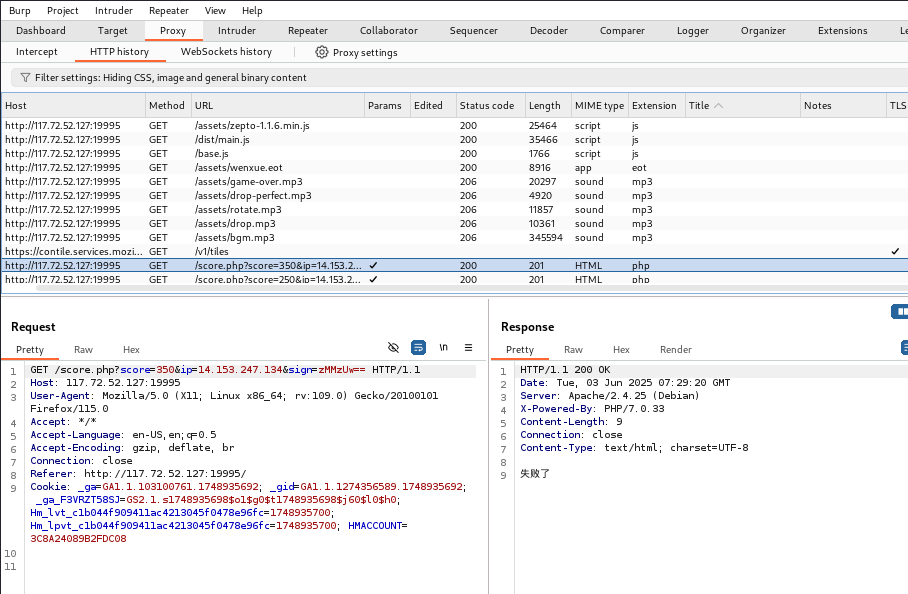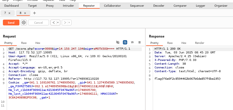 然后从burpsuite查看哀求的信息,发现有一个score.php有点可疑。