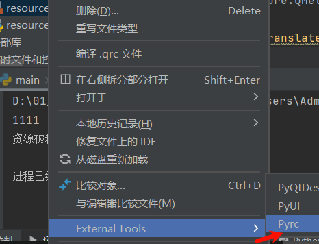 注意这个保存完毕之后,必要借助 如下,天生resource_rc.py文件,这个具体的设置可以参考之前的:关于PyQt5的环境搭建(Pycharm)_pyqt5环境变量设置-CSDN博客