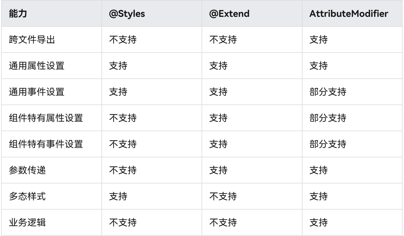 可以看出,与@Styles和@Extend相比,AttributeModifier提供了更强的能力和机动性,且在连续完满全量的属性和变乱设置能力,因此保举优先使用AttributeModifier。