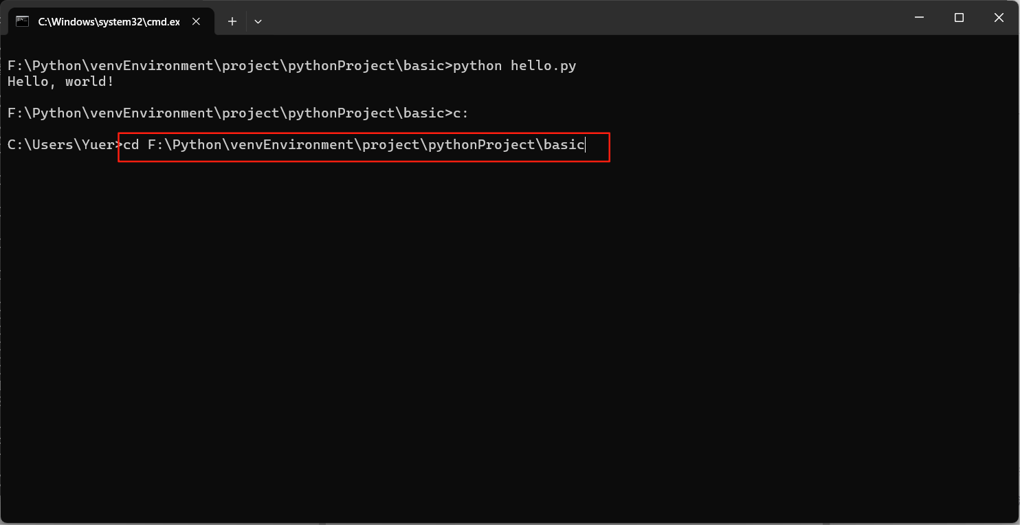 在Windows下的下令提示符(CMD),输入该文件地点路径F:\Python\venvEnvironment\project\pythonProject\basic,如下图: