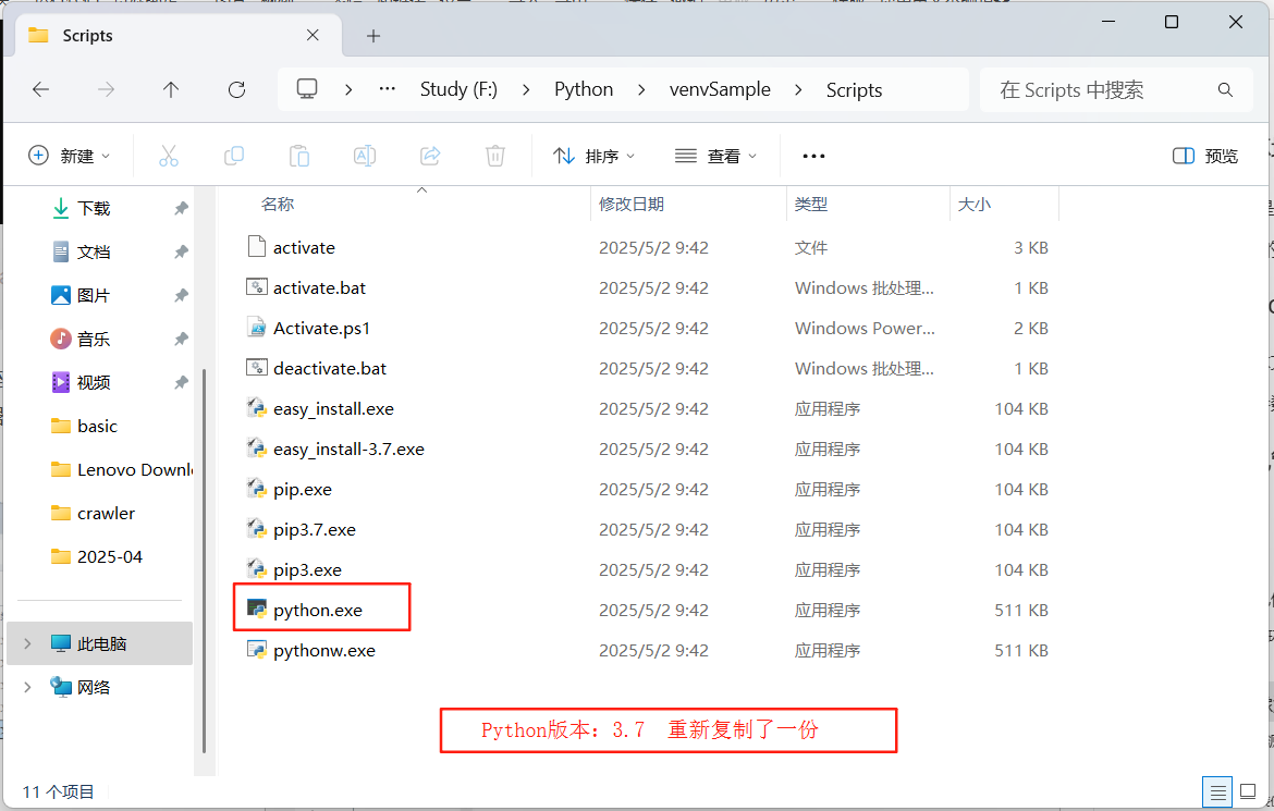 这个文件夹,将我当地的Python编辑器重新复制一份到此情况中,存于路径F:\Python\venvSample\Scripts下: