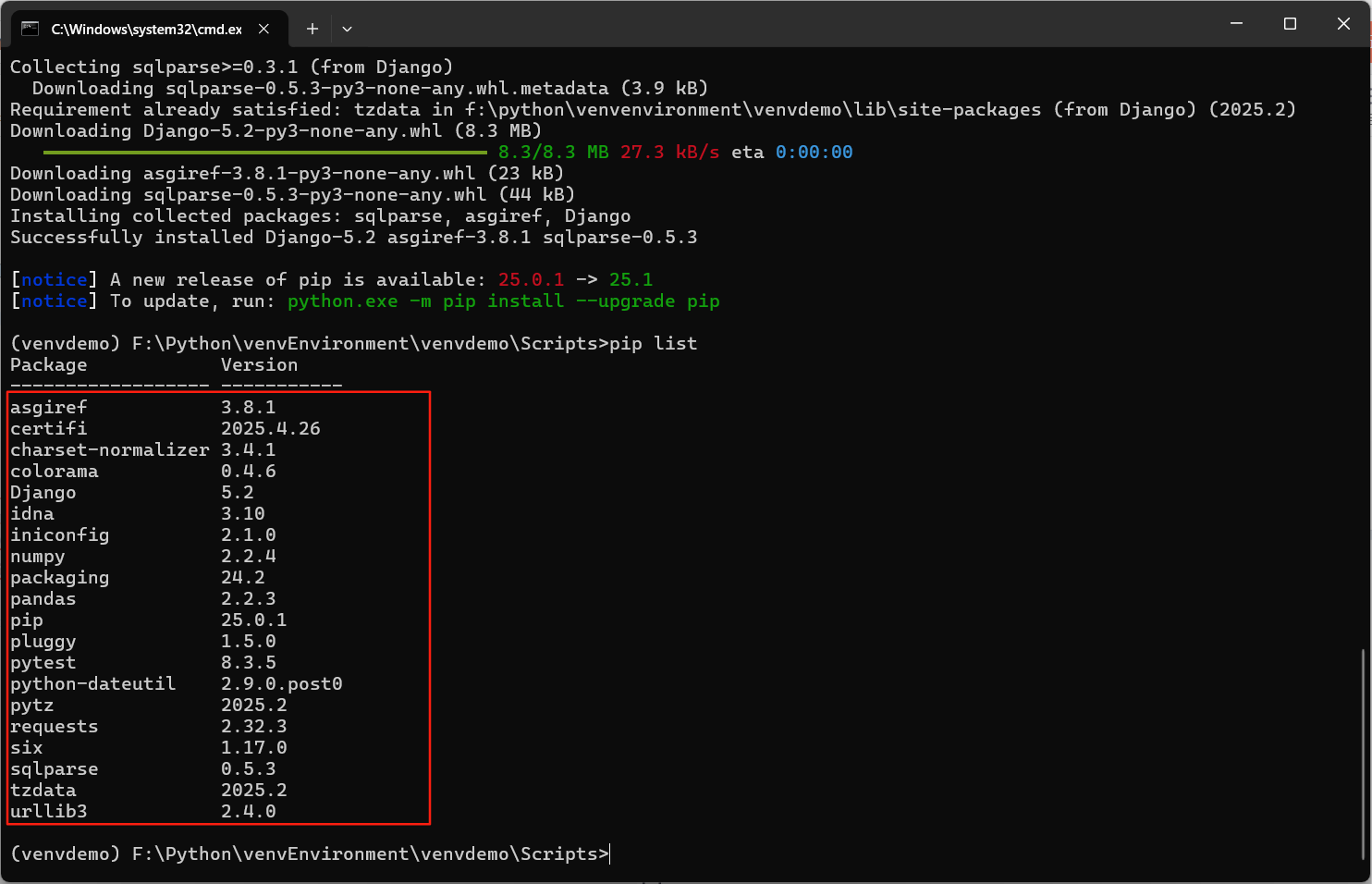 也可以指定版本举行安装,如下:- pip install Django == 5.2