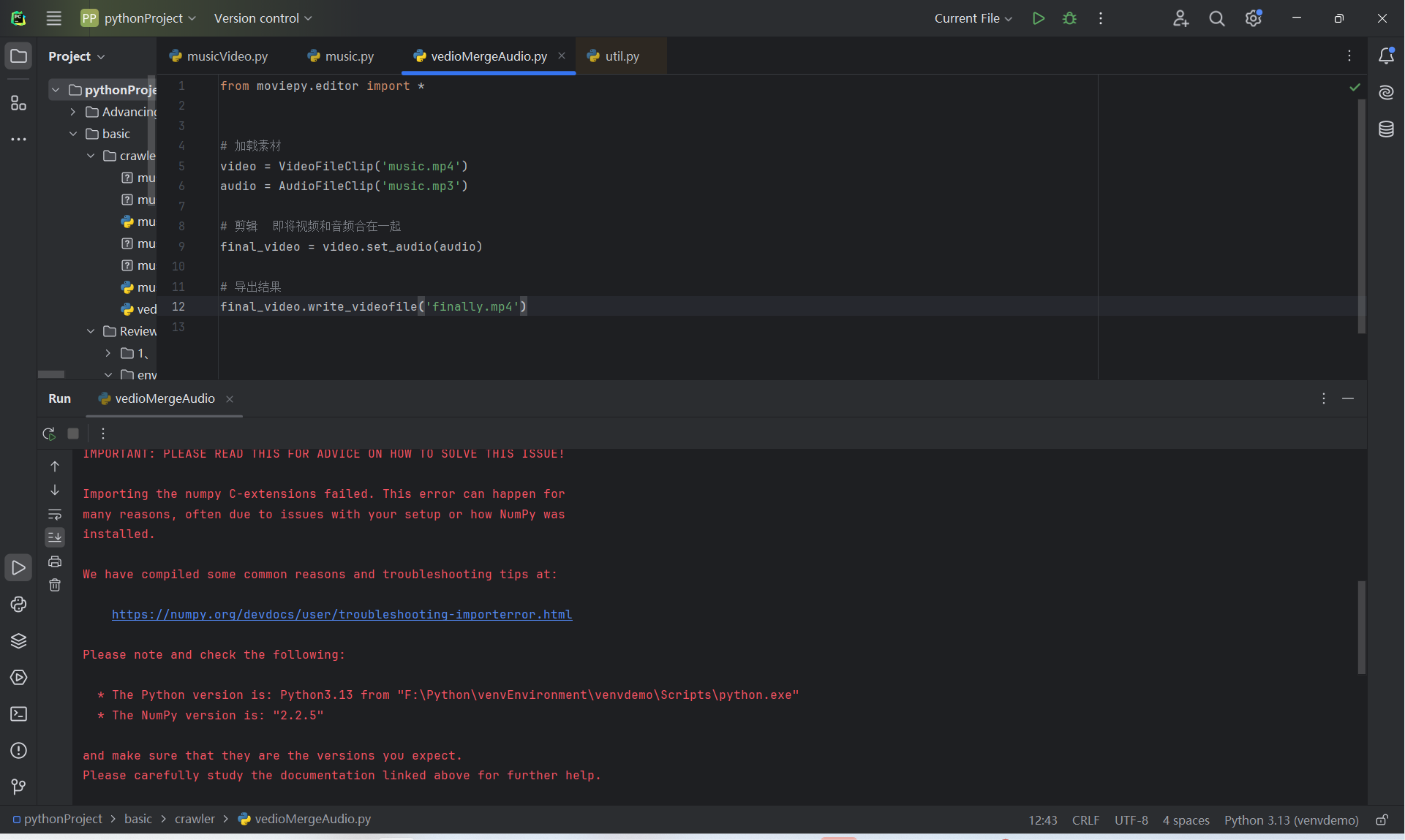 - File "F:\Python\venvEnvironment\project\pythonProject\basic\crawler\vedioMergeAudio.py", line 1, in <module>