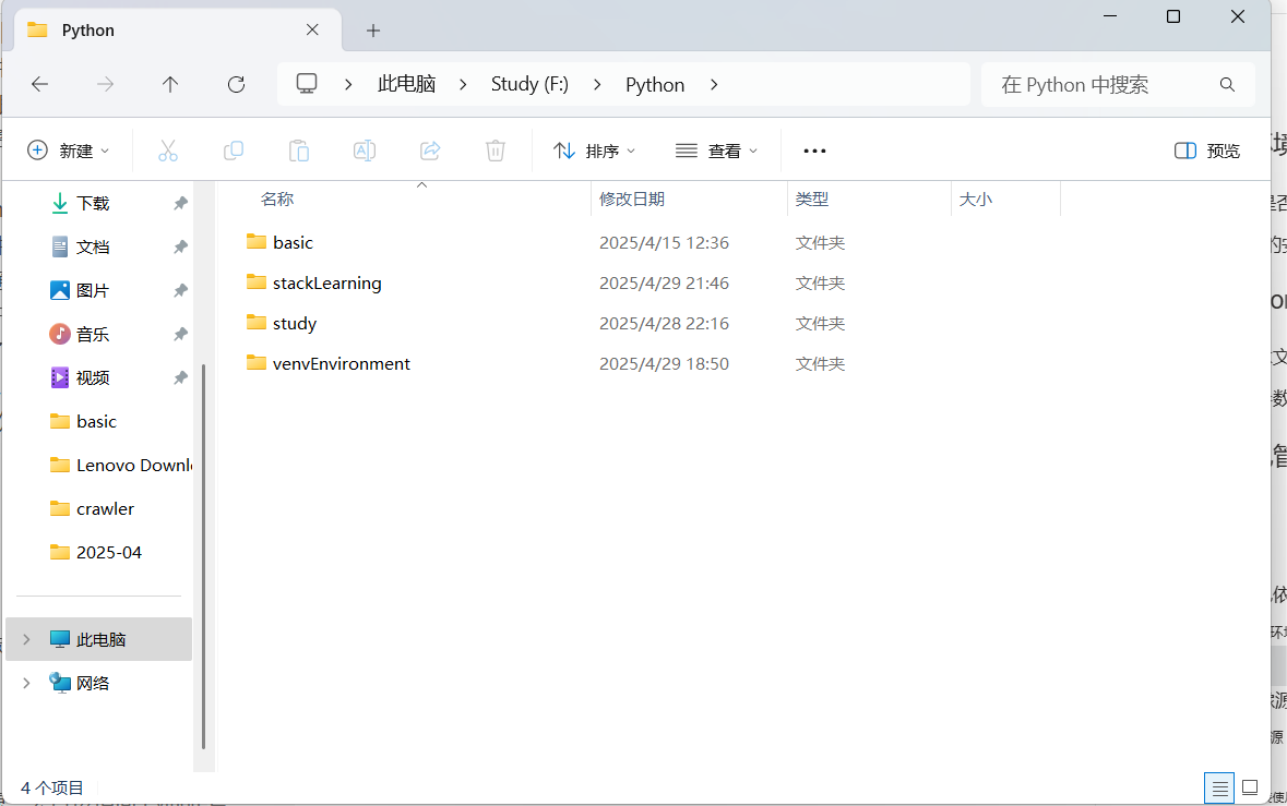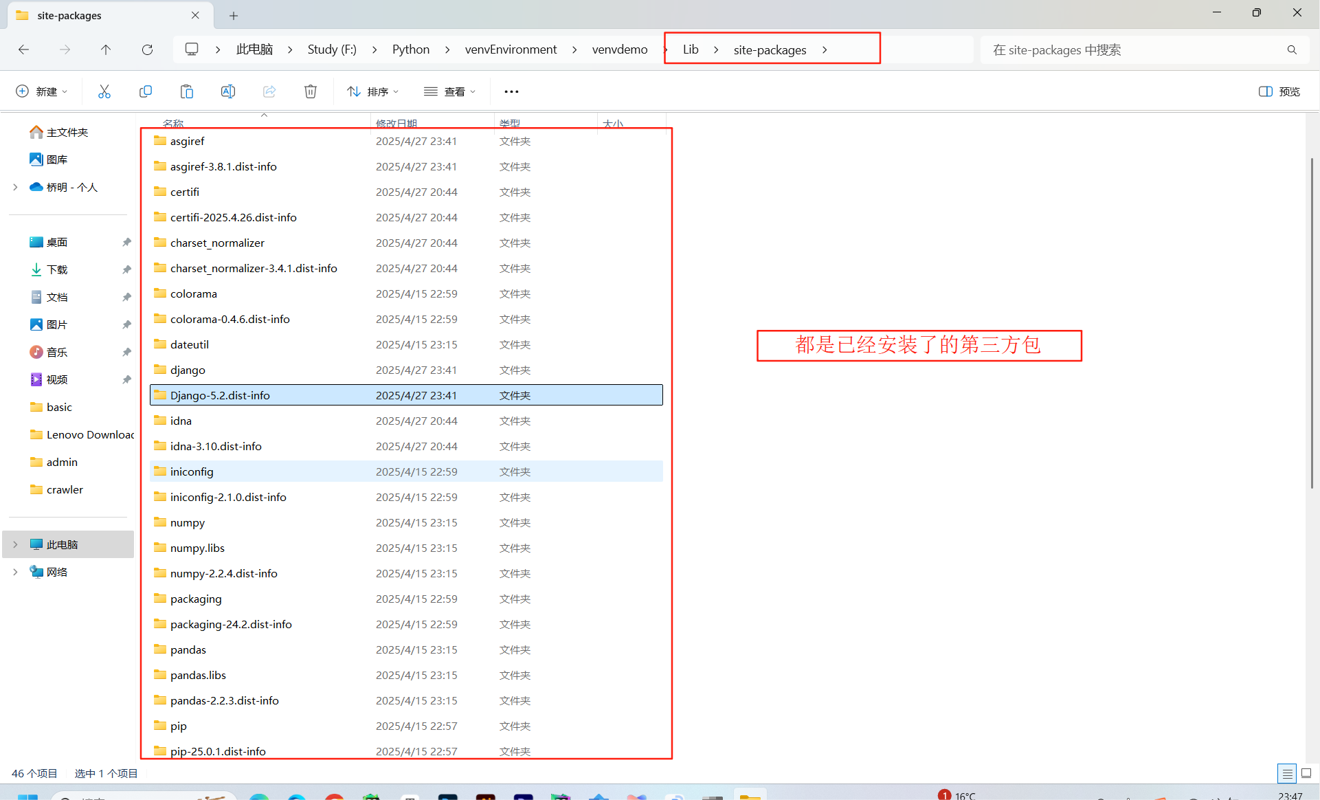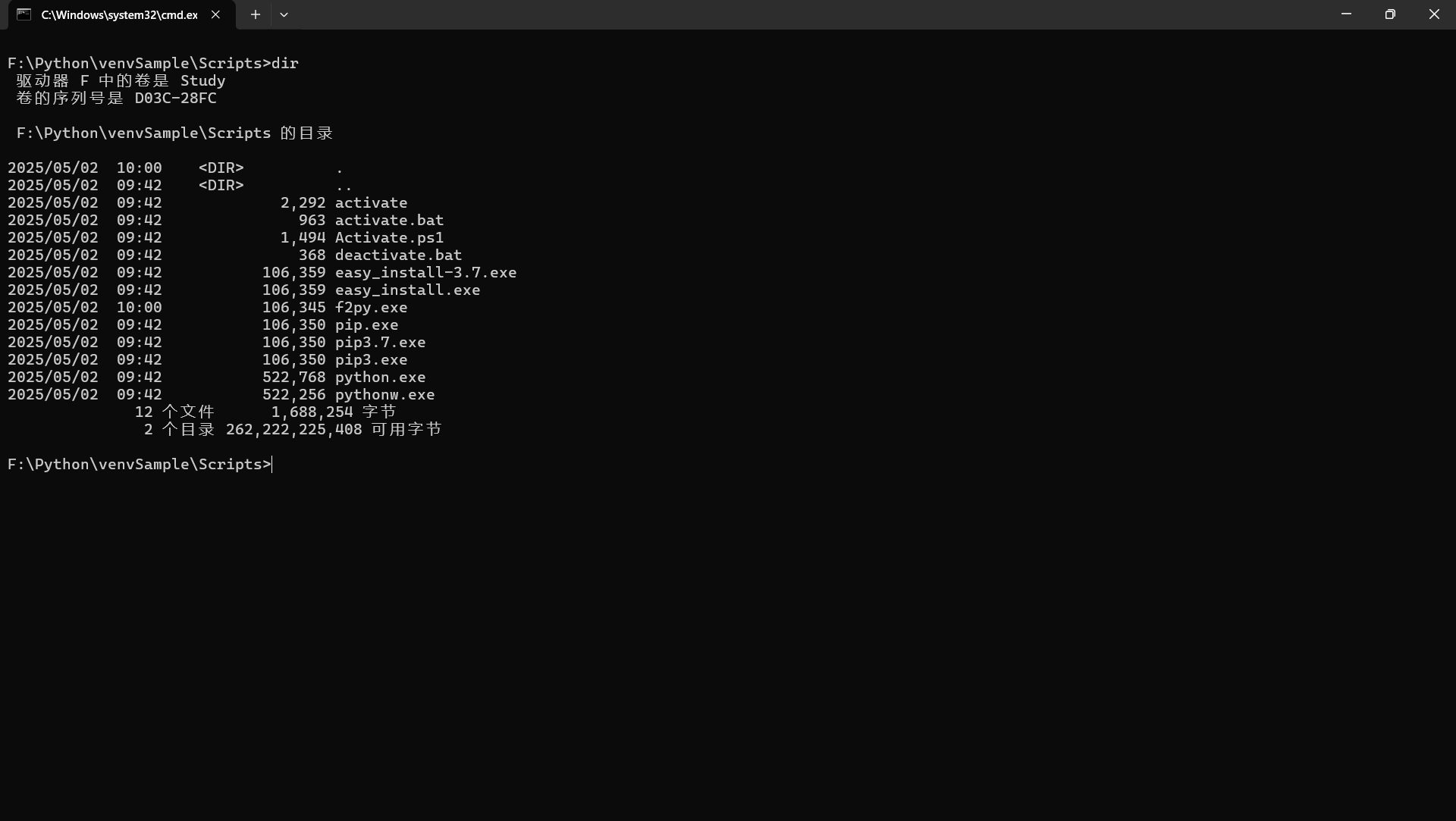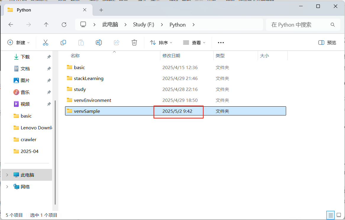 在路径F:\Python下,我们可以看到天生了一个venvSample的文件夹;