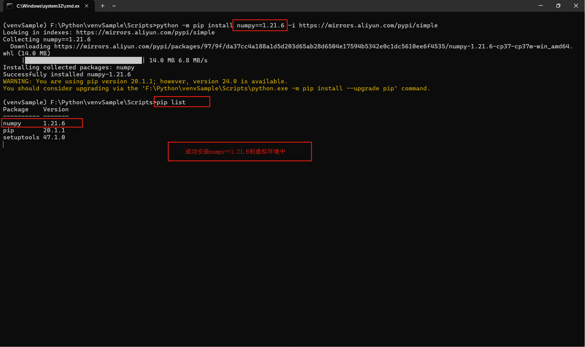 检察是否安装乐成,使用下令pip list来检察安装的三方库numpy==1.21.6;