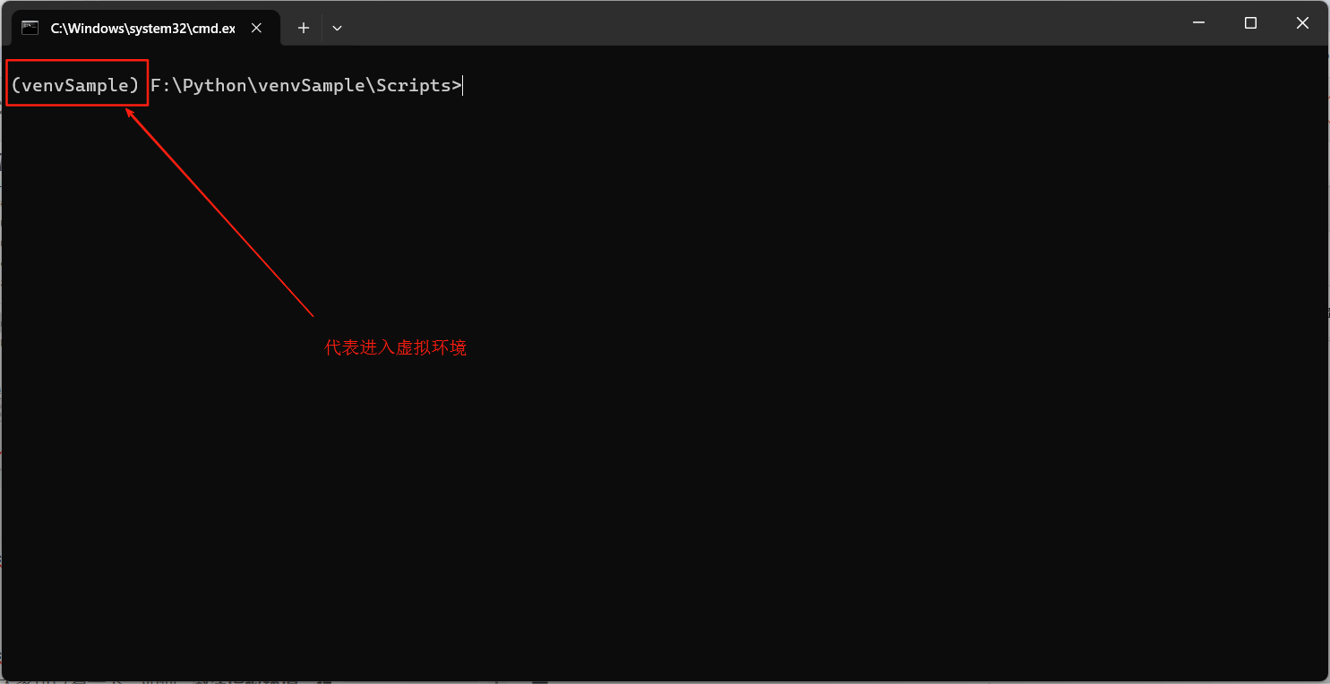 在下令提示符中,即CMD中,指定必要创建虚拟情况的路径,好比我要在路径F:\Python下创建一个名为venvSample的虚拟情况,则在CMD,中输入该路径,然后输入定名python -m venv venvSample,如下: