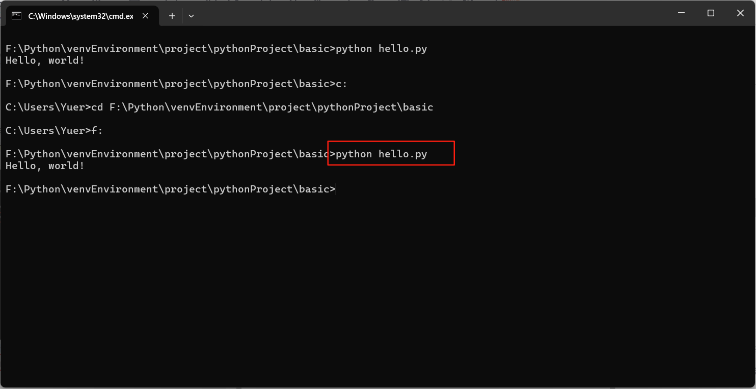 好比现在要实行路径F:\Python\venvEnvironment\project\pythonProject\basic下的hello.py,如下图: