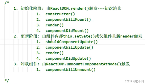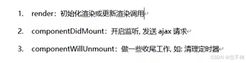 - componentWillUnmount:收尾,关闭定时器,取消消息。
