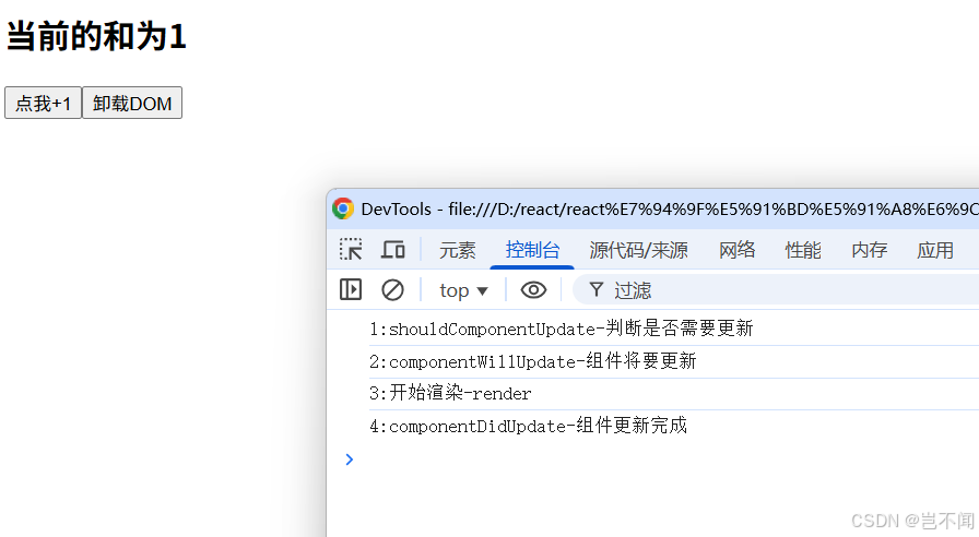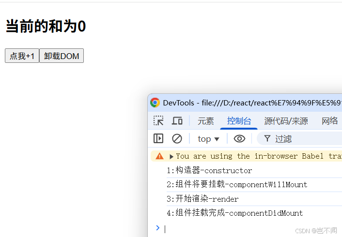 复制代码 整体代码 - <!DOCTYPE html><html lang="en"><head> <meta charset="UTF-8"> <meta http-equiv="X-UA-Compatible" content="IE=edge"> <meta name="viewport" content="width=device-width, initial-scale=1.0"> <title>Hello,React生命周期(旧)</title></head><body> <!-- 容器 --> <div id="test"></div> <!-- {/* // 引入 React焦点库 */} --> <script src="https://unpkg.com/react@16/umd/react.production.min.js"></script> <!-- {/* // 引入 react-dom 用于支持 react 操纵 DOM */} --> <script src="https://unpkg.com/react-dom@16/umd/react-dom.production.min.js"></script> <!-- {/* // 引入 babel:1. ES6 ==> ES5 2. jsx ==> js */} --> <script src="https://unpkg.com/babel-standalone@6/babel.min.js"></script> <!-- {/* // 引入 JSX 语法 */} --> <script type="text/babel"> // 1. 创建组件 class Count extends React.Component { state = {count: 0} add=()=>{ // 获取原状态 const {count} = this.state // 状态更新 this.setState({ count: count+1 }) } death=()=>{ ReactDOM.unmountComponentAtNode(document.getElementById('test')) }