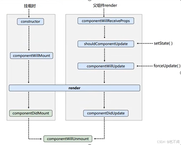 forceUpdate--》componentWillUpdate--》render--》componentDidUpdate--》componentWillUnmount
