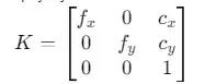 在这里,f_x 和 f_y 是相机沿程度和垂直方向的焦距(以像素为单位),c_x 和 c_y 是图像平面上主点的像素坐标(通常是图像的中心)。