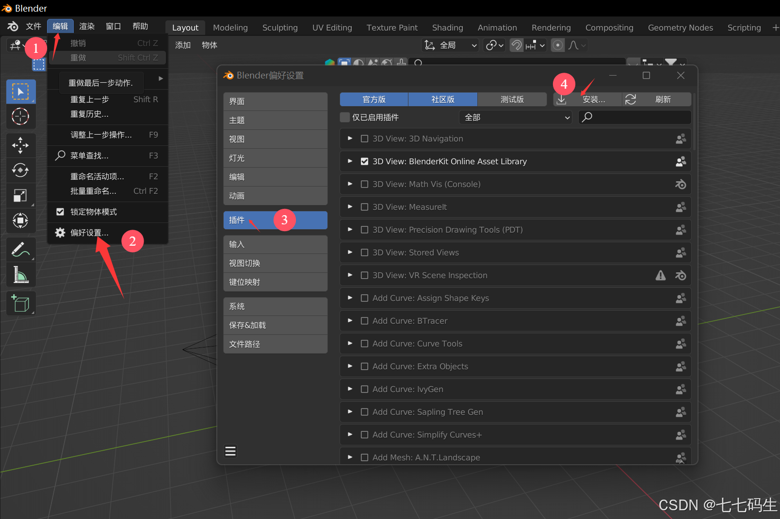 然后进入blender,点击左上角的编辑-》偏好设置-》插件-》安装,选择刚下载文件**addon.py**