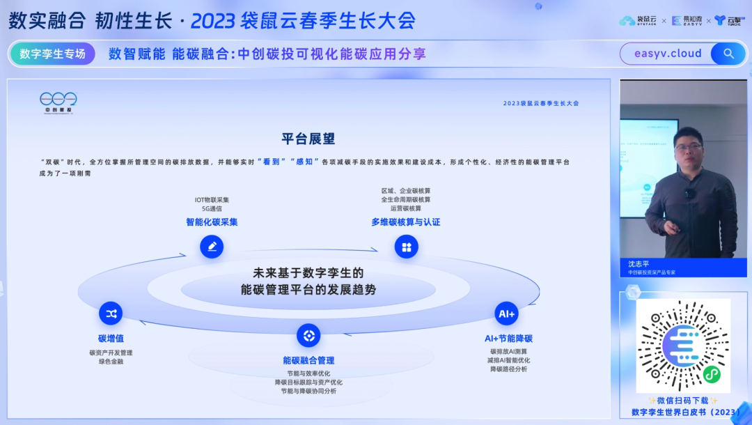 会上,中创碳投科技有限公司的资深产品专家沈志平带来中创碳投可视化能碳应用分享,包含当下能碳领域前沿趋势洞察、产品架构以及能碳管理平台应用实践等丰富内容。沈志平表示,未来将继续与易知微联合推进基于数字孪生的“能碳”全流程服务平台,为政府、企业和园区等各类用户提供丰富的降碳路径管理,达到可视、可感和可管的“双碳”建设成效。